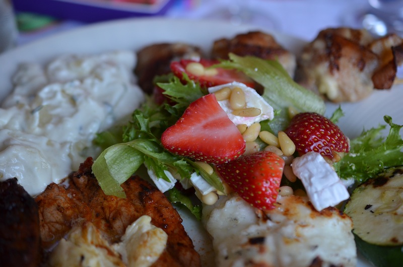 Eilinen vappupäivän iltapäivä ja ilta tuli vietettyä hyvässä seurassa meidän seinänaapureiden takapihalla auringosta nauttien ja grillaillen. Meidän oma takapiha ja terassi on tällä hetkellä todella kaoottisessa kunnossa, kiitos meneillään olevan kylppärirempan, joten siirryttiin suosiolla aidan toiselle puolelle. Ollaan järkätty tällä samalla kaavalla yhdessä mm. brunssia ja muuta illanistujaista ja eilen vappupäivän menu koostui muutamista erilaisista pihveistä, kanasta, mansikka-vuohenjuusto-pinjansiemen-balsamico-salaatista, grillatuista kasviksista ja ananaksesta, perunasalaatista, täytetyistä herkkusienistä ja marinoiduista sipuleista. Kyllä ruoka vaan on hyvää!