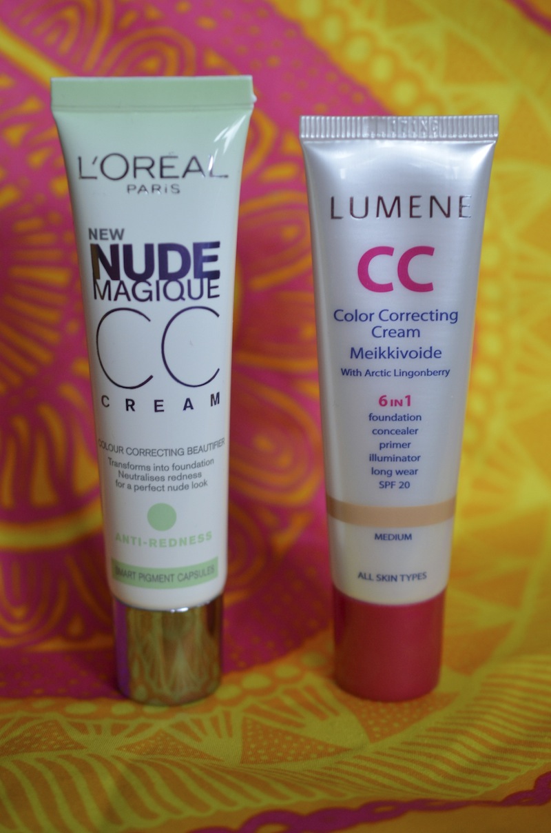 L’oréalin ja Lumenen CC-voiteet. Jos joku on vasta oppinut mitä BB-voiteet ovat, kerrottakoon että CC-voiteet ovat nyt jo se juttu. CC-voiteet ovat toisin sanoen vielä pidemmälle vietyjä BB-voiteita ja niistä löytyy vielä enemmän ja parempia ominaisuuksia, kuin BB-voiteista.