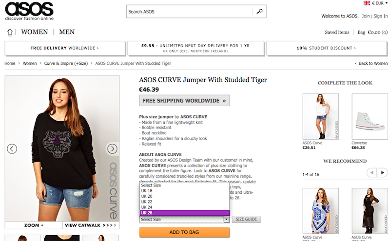 Koot ovat ASOSilla mielestäni vähän Suomen kokoja reilumpia, mutta muuten brittimallistoihin verrattuina pitävät kyllä paikkansa. Plussapuolen koot lähtevät UK-koosta 18, joka vastaa Suomen kokoa 46. Tuota 18-kokoa löytyy myös ”normipuolen” mallistosta hieman ”pienempänä” mitoituksena, joten kannattaa ehdottomasti tutkia myös sen tilanne, mikäli keikkuu juuri tuolla normimalliston ja plussamalliston rajamailla. Kirjoitin aiemmin, että ASOSilta saa myös toisinaan täysin samaa tuotetta normaalikokojen puolelta ja plussapuolelta, joka on mielestäni huima askel.