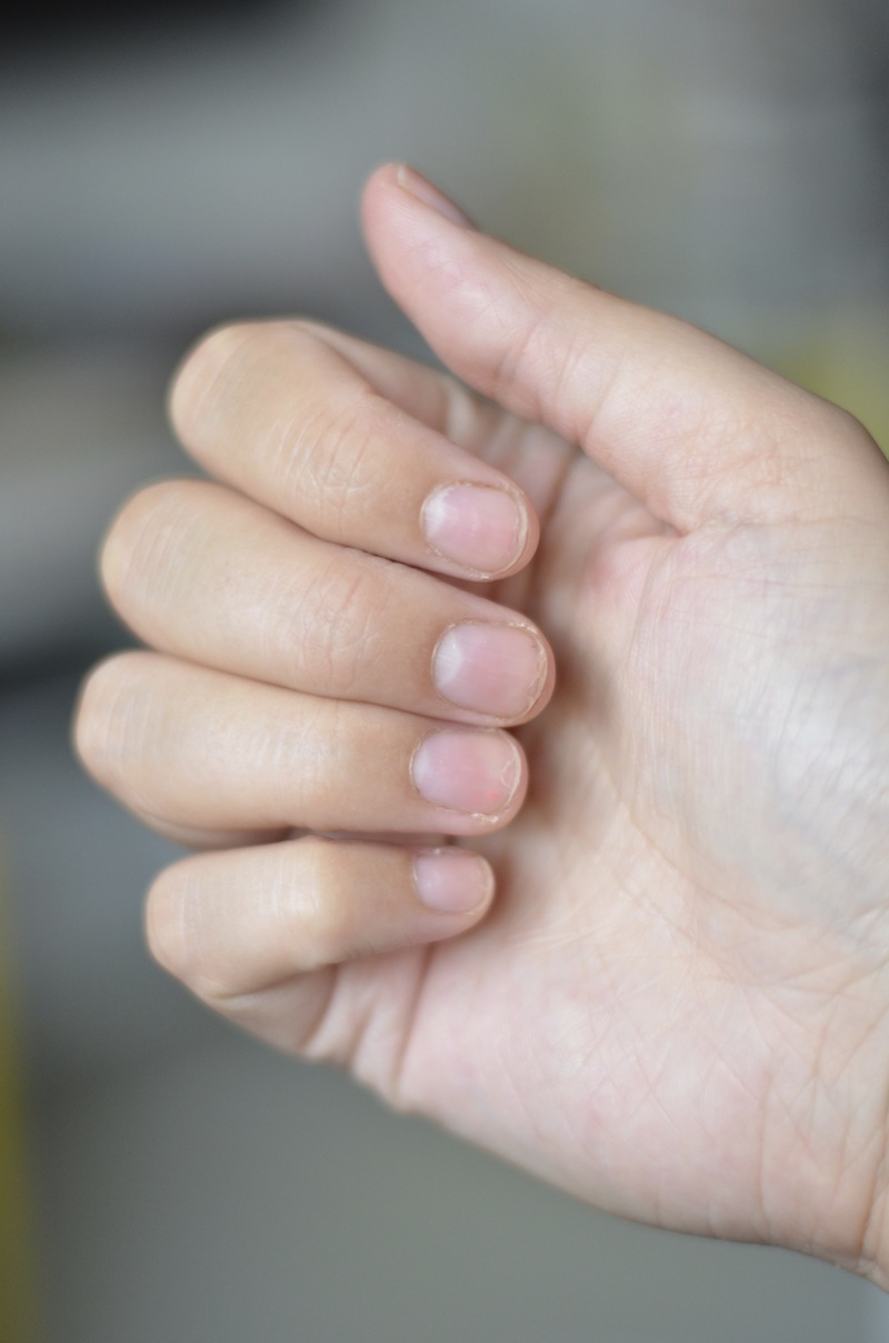 Hiusten lisäksi, joita ”pelastin” jo ulkoisesti eilen, apua kaipaavat myös kynteni, jotka näyttävät aivan kamalilta. Tunnustan nyt teille, etten ole koskaan leikannut kynsiäni saksilla (heh). Puren siis aina kynteni lyhyeksi. Olen purrut kynsiäni lapsesta saakka, mutta minulle ei ole ongelma kasvattaa myöskään pitkiä kynsiä (paitsi jääkiekon mm-kisojen aikaan) mikäli niin haluan. Viime kynsienkasvatusoperaationi tyssäsi tosin siihen, että kynnet vaan lohkeilivat tai oikeastaan repeilivät pois ja kuten kuvasta huomaa, kynsi liuskottuu todella helposti.