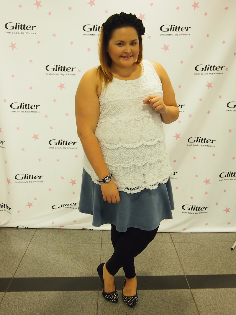 Reissua edeltävänä torstai-iltana olin mukana järkkäämässä VIP-iltaa Forumin Glitterissä ja siellä tuli napattua myös asukuvat kuvausseinän edessä. Joku jo ehti tuon kukkapannan perään kyselläkin ja se on siis Glitteristä. Aiemmin näitä samoja oli myynnissä punaisia, sinisiä ja valkoisia, mutta enää jäljellä oli ainoastaan muutama kappale näitä mustia ja nappasinkin yhden niistä illaksi päähäni. No sain illan päätteeksi pannan sitten kotiinviemisiksi ja mukaan lähti myös tuo räyheä So-B:n pääkallorannekoru. Tykkään!