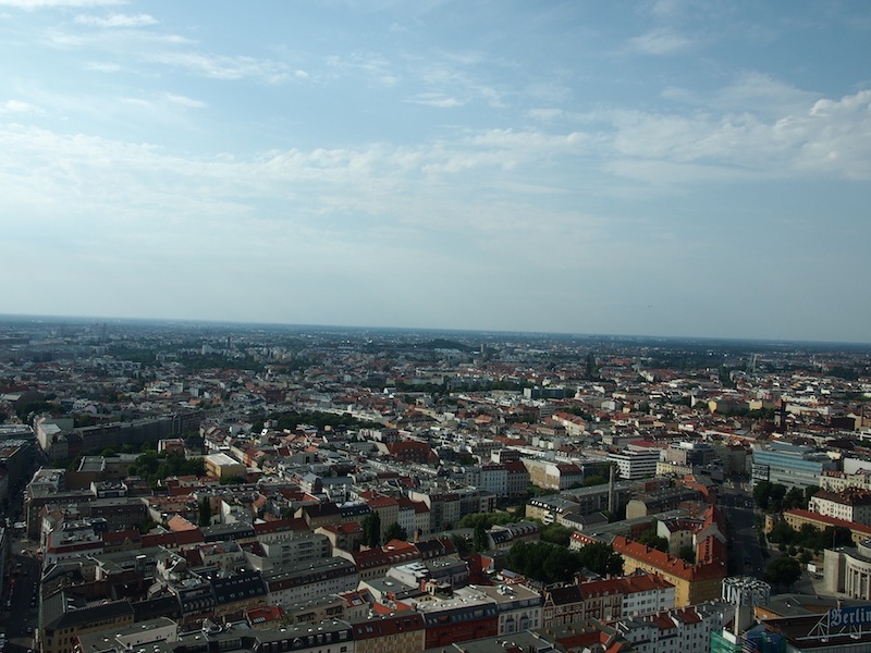 Mikäli mielit tutkia Berliiniä ja sen lähialueita lintuperspektiivistä ja TV-tornin 12€ pääsymaksu tuntuu turhan suolaiselta, suuntaa Park Inn hotellin terassille Alexanderplatzille aivan TV-tornin tuntumaan. Hotelli kuulemma itsessään on ilmeisesti parhaat päivänsä jo nähnyt, mutta näkymät terdeltä yli Berliinin ovat kyllä komeat. Neljän euron sisäänpääsymaksun siivin voit hengata ja nautiskella juomia aurinkotuoleissa 40. kerroksessa. Hissi ei mene ihan huipulle asti, joten varaudu nousemaan pari kerrosta portaita omin voimin. Ilmeisesti tuolta voi tehdä myös jonkunlaisen hypyn, mutta me jätettiin tällä kertaa hyppäämättä. Oppaamme Maiski oli käynyt tuolla myös talvella ja silloin tunnelma siinä glühweinia siemaillessa oli ollut kuulemma vieläkin parempi. Miinusta siitä, että terde on aika pieni ja ylhäällä ei ole WC:tä.