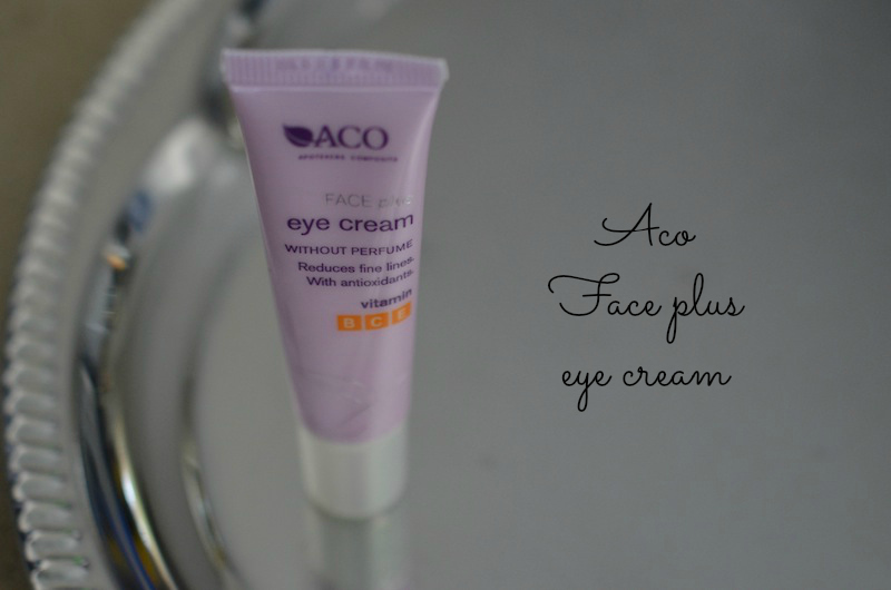 ACO:n Face Plus eye cream on suunnattu kolmekymppisille juurikin ikääntymisen merkkejä vastaan. Tuote lupaa sisältävänsä antioksidantteja, kuten B-, C- ja E-vitamiineja. Tämäkin tuote on hajustamaton. Purkissa on kätevä nokka, jolla saa annosteltua sopivan pienen määrän tuotetta. Vaikka tuote on voidemaista, imeytyy se hyvin ihoon ja raaka-aineet eivät tuoksu iholla häiritsevästi.