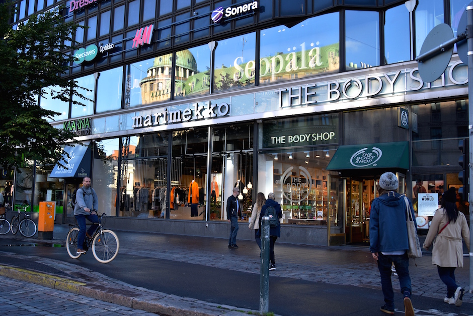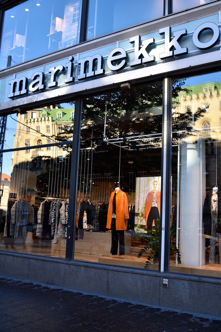Myymälä sijaitsee aivan Forumin Mannerheimintien pääovien vieressä ja kutsuu kauniilla näyteikkunoillaan tutustumaan tarjontaansa niin ohikulkijat kuin vartavasten Marimekkoon suuntaajat. Pyöripä myymälässä kanssani kameran kanssa samaan aikaan tietysti myös muutama aasialaisturistikin, jotka tuntuvat olevan osa Marimekon vakiovarustusta.